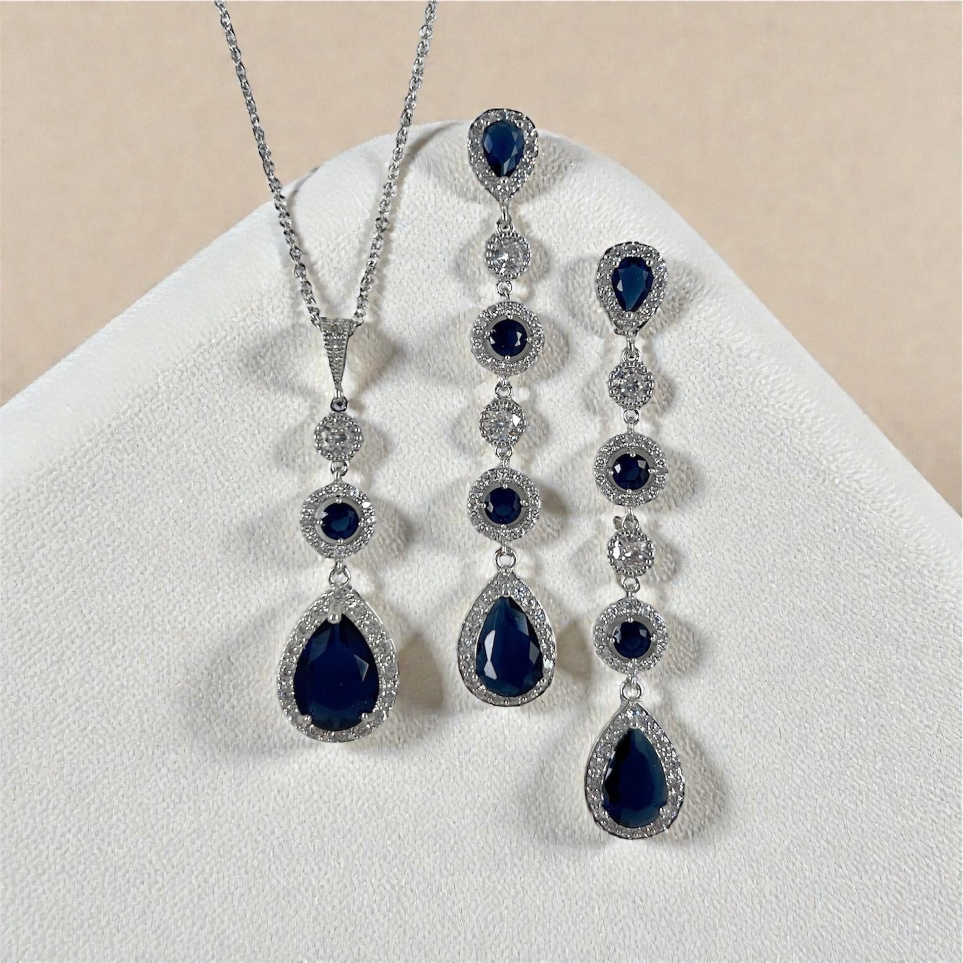 Blue Sapphire Teardrop Bridal Necklace and Earrings Jewelry Set