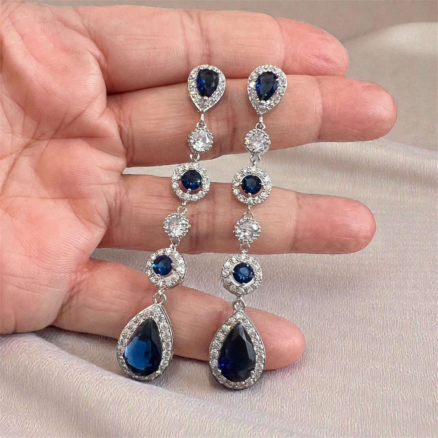 Blue sapphire crystal bridal jewelry set featuring a long teardrop necklace and matching statement earrings, handcrafted for weddings and formal occasions. A striking “something blue” set that adds elegance and drama to any bridal look.