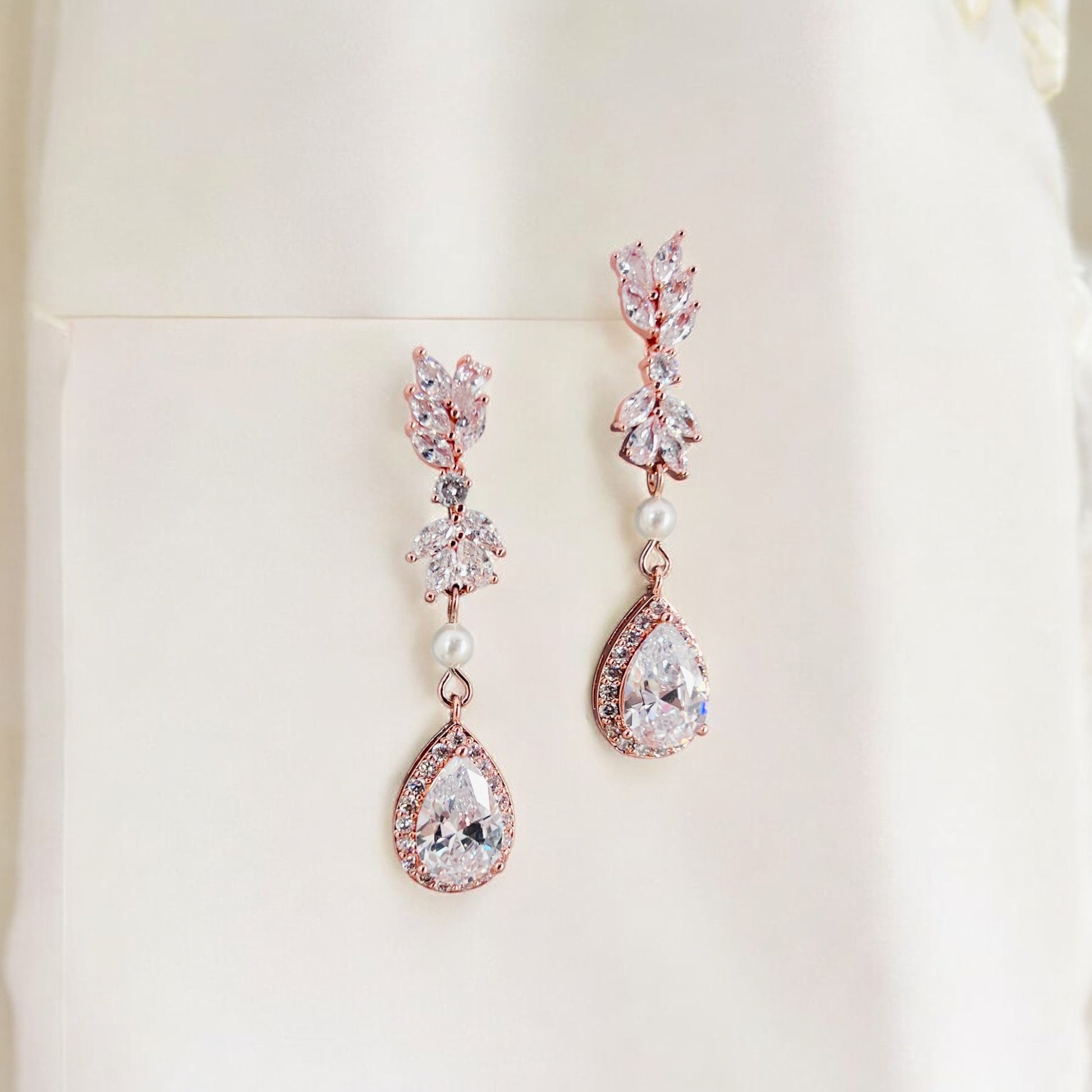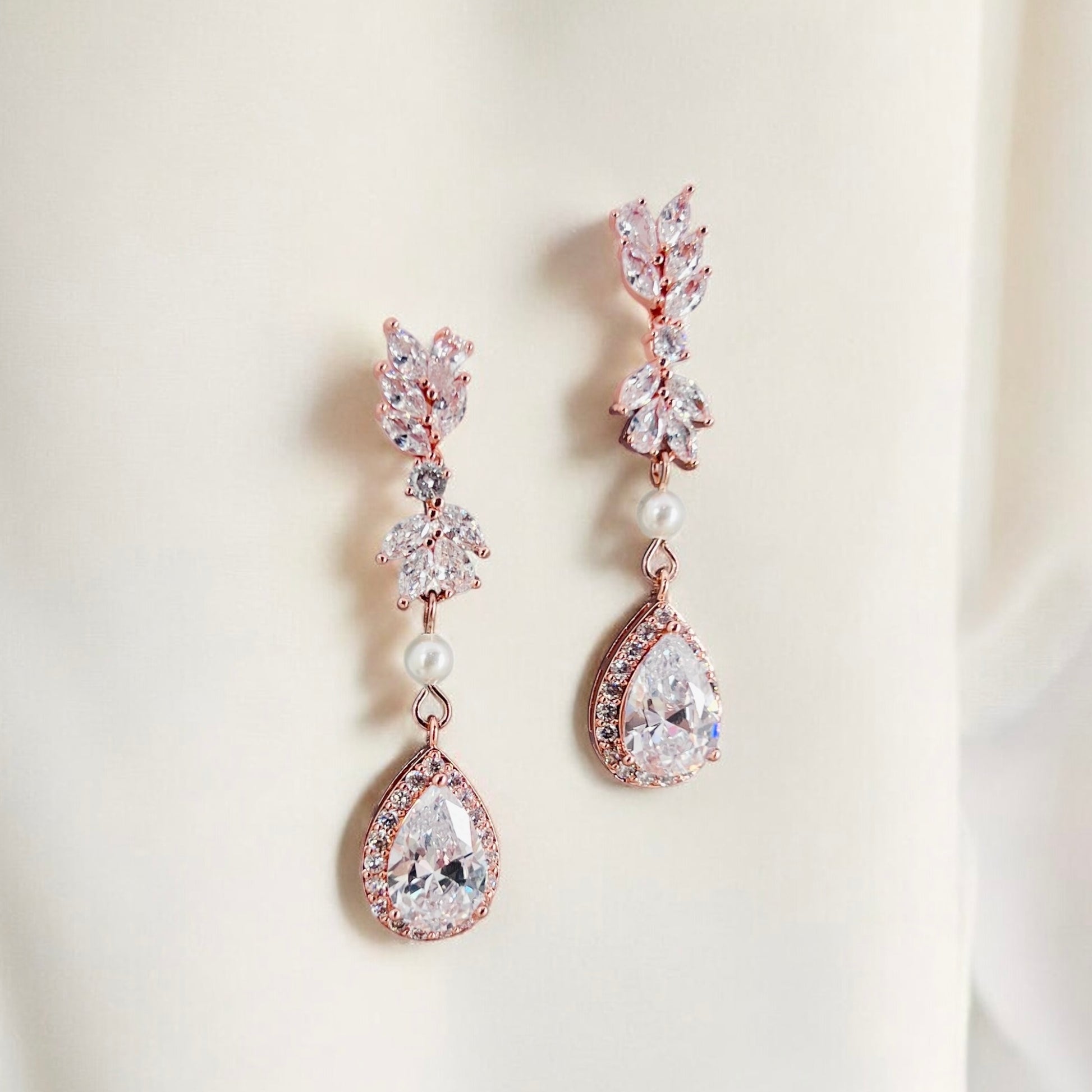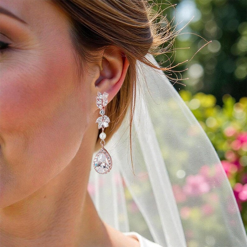 Handmade rose gold teardrop crystal earrings featuring halo cubic zirconia stones, marquise crystal leaf accents, and a soft pearl connector for gentle movement and sparkle. Lightweight and comfortable to wear, these elegant drop earrings are designed for weddings, formal occasions, and meaningful gifts.