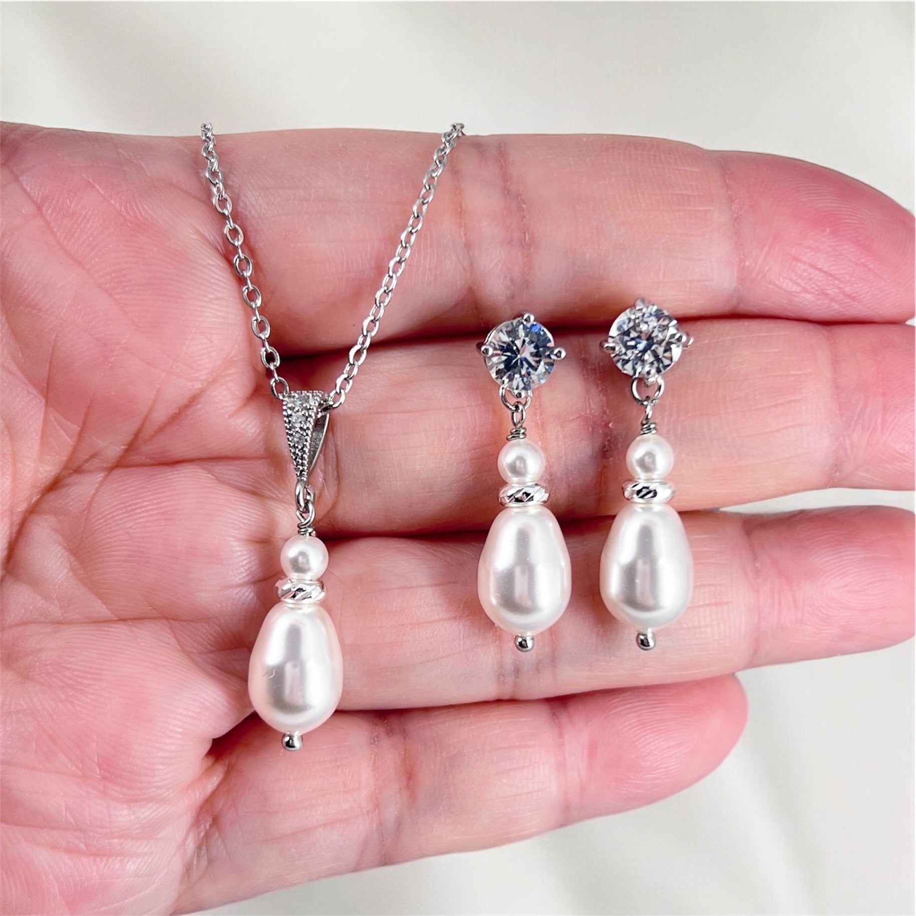 These silver pear-shaped pearl drop earrings and necklace set feature beautiful crystal pearls with soft shimmer. Lightweight and graceful, they’re comfortable to wear all day. Perfect for weddings and special occasions, they add a classic, gentle sparkle to any outfit.